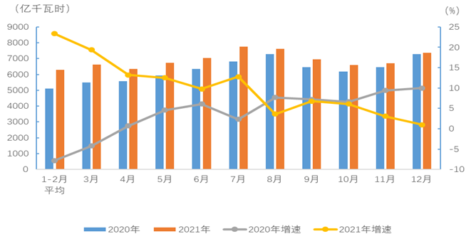 圖1 2020、2021年分月全社會用電量及其增速
