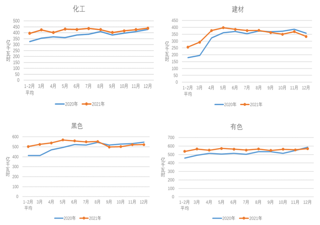 1-12月,化工行業(yè)用電量5097億千瓦時,同比增長6.9%,增速比上年同期提高4.5個百分點;建材行業(yè)用電量4211億千瓦時,同比增長7.4%,增速比上年同期提高3.7個百分點;黑色金屬冶煉行業(yè)用電量6361億千瓦時,同比增長6.7%,增速比上年同期提高2.8個百分點;有色金屬冶煉行業(yè)用電量7002億千瓦時,同比增長5.4%,增速比上年同期回落0.1個百分點。