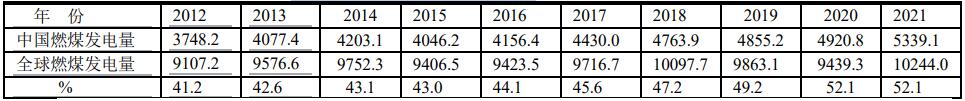 中國(guó)占全球燃煤發(fā)電的比例(單位:TWh)