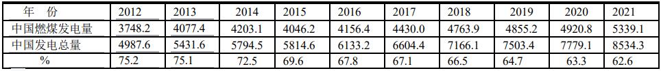 根據(jù)BP2022年報(bào)告,2021年中國(guó)燃煤發(fā)電占中國(guó)發(fā)電量5339.1/8534.3=62.6% ;中國(guó)燃煤發(fā)電占全球燃煤發(fā)電量5339.1/10244.0=52.1%;中國(guó)燃煤發(fā)電占全球發(fā)電總量5339.1/28466.3=18.8%。