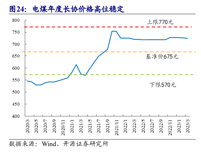 長(zhǎng)協(xié)價(jià)格穩(wěn)定、比例提升—煤企盈利確定—估值重構(gòu)邏輯凸顯。價(jià)格方面,2022年,下水動(dòng)力煤年度長(zhǎng)協(xié)基準(zhǔn)價(jià)按675元/噸執(zhí)行,較2020-2021年的535元/噸大幅提升,2022年,動(dòng)力煤年度長(zhǎng)協(xié)價(jià)格維持在720元/噸附近,動(dòng)力煤年度長(zhǎng)協(xié)價(jià)格高位穩(wěn)定。同時(shí),電煤現(xiàn)貨限價(jià)執(zhí)行1.5倍長(zhǎng)協(xié),港口限價(jià)1155元/噸。2022年,京唐港動(dòng)力煤均價(jià)1273元/噸,全年均價(jià)超過(guò)電煤現(xiàn)貨限價(jià)10.3%,且大幅高于電煤年度長(zhǎng)協(xié)價(jià)格。即使現(xiàn)貨價(jià)格下跌,年度長(zhǎng)協(xié)價(jià)格遠(yuǎn)低于現(xiàn)貨價(jià)格,我們預(yù)計(jì)未來(lái)幾年長(zhǎng)協(xié)價(jià)格亦難有下跌空間,當(dāng)前年度長(zhǎng)協(xié)價(jià)格724元/噸,離上限770元/噸,仍有上漲空間。比例方面:隨著發(fā)改委對(duì)煤炭中長(zhǎng)期合同監(jiān)管工作的重視,2022年電煤中長(zhǎng)期合同比例逐漸提升。晉控電力煤炭年度長(zhǎng)協(xié)比例從2022年Q1的61%提升到2022年Q1-Q3的80%。我們測(cè)算,國(guó)電、華能、華電、大唐四大電力集團(tuán)符合價(jià)格的長(zhǎng)協(xié)比例預(yù)計(jì)從2021年Q4的23%提升至2022年Q4的72%。2022年10月31日,發(fā)改委印發(fā)《2023年電煤中長(zhǎng)期合同簽訂履約工作方案》的通知,要求原則上每個(gè)煤炭企業(yè)電煤中長(zhǎng)期合同任務(wù)量不應(yīng)低于自有資源量的80%,不低于動(dòng)力煤資源量的75%,其中,2021年9月份以來(lái)核增產(chǎn)能的保工煤礦核增部分按承諾要求全部簽訂電煤中長(zhǎng)期合同。2023年,電煤長(zhǎng)協(xié)價(jià)格有望維持高位,長(zhǎng)協(xié)比例預(yù)計(jì)維持2022年Q4水平。考慮到煤炭行業(yè)新的產(chǎn)能周期無(wú)法順利開(kāi)啟,未來(lái)相當(dāng)長(zhǎng)一段時(shí)間內(nèi),煤炭將處于保供穩(wěn)價(jià)狀態(tài),煤炭行業(yè)確定性邏輯從2022年開(kāi)始演繹。長(zhǎng)協(xié)價(jià)格高位穩(wěn)定、比例較高—煤企盈利穩(wěn)定—煤炭股估值重構(gòu)的邏輯非常明顯。