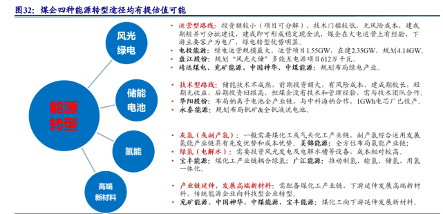 (1)風(fēng)光綠電。風(fēng)光綠電轉(zhuǎn)型為運(yùn)營(yíng)型轉(zhuǎn)型路線,是煤企能源轉(zhuǎn)型的主要路徑之一,該路徑具有投資額較小、項(xiàng)目可分解、技術(shù)門(mén)檻相對(duì)較低、風(fēng)險(xiǎn)成本低等特點(diǎn)。風(fēng)光綠電建成期短并可分批建設(shè),建成即能形成穩(wěn)定的現(xiàn)金流。由于大部分煤企具有坑口火電廠,煤炭下游客戶(hù)主要為電廠,煤企具有一定的電力運(yùn)營(yíng)能力,風(fēng)光綠電轉(zhuǎn)型具有明顯優(yōu)勢(shì),是煤企轉(zhuǎn)型初期的主要路徑。電投能源:上市煤企中風(fēng)光綠電運(yùn)營(yíng)規(guī)模最大,運(yùn)營(yíng)項(xiàng)目1.55GW,在建2.35GW,規(guī)劃4.14GW。盤(pán)江股份:規(guī)劃發(fā)展風(fēng)電、光伏、火電、抽水蓄能項(xiàng)目612萬(wàn)千瓦,“風(fēng)光火儲(chǔ)”多能互補(bǔ),前景廣闊。靖遠(yuǎn)煤電、兗礦能源、中國(guó)神華、中煤能源:規(guī)劃布局綠電產(chǎn)業(yè)。