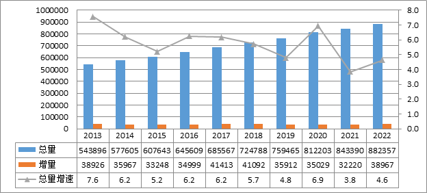 2022年,全國電網(wǎng)220千伏及以上變電設(shè)備容量共51.98億千伏安,同比增長5.2%;220千伏及以上輸電線路回路長度共88.2萬千米,同比增長4.6%。