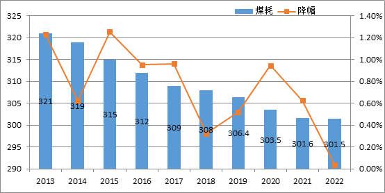 據(jù)中電聯(lián)快報數(shù)據(jù),2022年全國6000千瓦及以上電廠供電標準煤耗301.5克/千瓦時,同比降低0.1克/千瓦時,較2013年下降了19.5克/千瓦時。