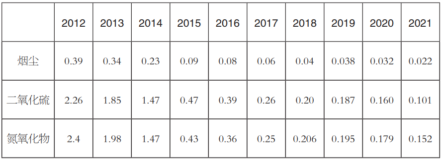 表11 2012—2021年單位火電發(fā)電量的排放量(單位:克/千瓦時)