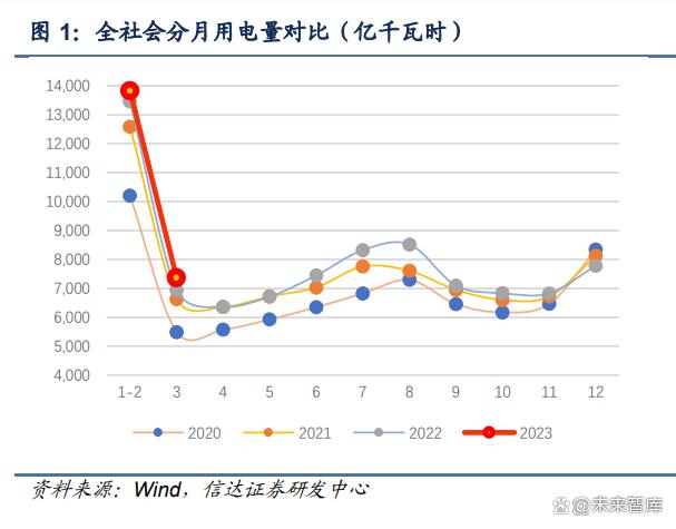 結(jié)構(gòu)方面,2023Q1 第一產(chǎn)業(yè)用電量同比增長 9.7%,第二產(chǎn)業(yè)用電量同比增長 4.2%,第三產(chǎn)業(yè)用電量同比增長 4.1%,而城鄉(xiāng)居民生活用電量同比增長僅 0.2%(一二三產(chǎn)及居民 生活用電占全社會用電量的比重分別為 1.25%、65.17%、17.43%、16.15%),居民生活 用電的低增長拖累一季度整體用電量的增速。從電力消費彈性系數(shù)來看,2022 年度全社會 用電量增速為 3.6%,GDP 增速為 3%,電力消費彈性系數(shù)達到 1.2;然而受居民生活用電 2023Q1 增速大幅放緩的影響,2023Q1 我國在實現(xiàn) 4.5%的 GDP 增速同時,用電量增速僅 3.6%,電力消費彈性系數(shù)下降至 0.8。 其中,1-2月一、二、三產(chǎn)業(yè)和城鄉(xiāng)居民生活用電量分別同比變化6.64%、3.48%、-0.11%、 2.75%,而 3 月單月的一、二、三產(chǎn)業(yè)和城鄉(xiāng)居民生活用電量分別同比變化 18.65%、 6.67%、14.04%、-5.76%。3 月以來開工復(fù)蘇潮表現(xiàn)明顯,二產(chǎn)用電增速穩(wěn)中向好,三產(chǎn) 用電增速大幅反彈,但 3 月份居民生活用電同比下降 5.76%,相較于去年同期(2022 年 3 月)高達 8.92%的居民生活用電增速,降幅高達 14.68pct。暖冬對于居民生活用電影響較 大,2 月下旬至 3 月上旬,我國中東部地區(qū)氣溫明顯升高,相比常年同期偏暖。