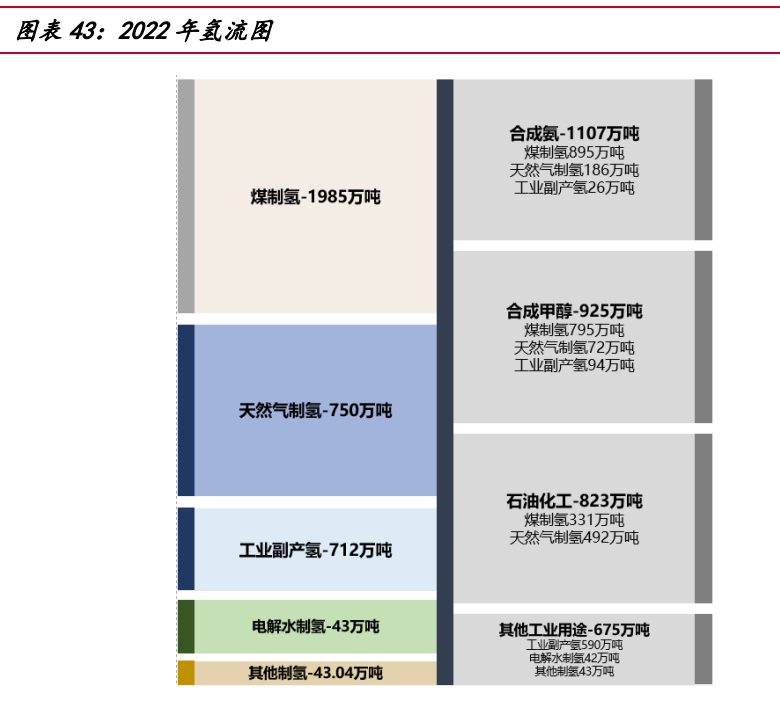 當前國內(nèi)氫能大部分應用于工業(yè)領(lǐng)域,包括合成氨、合成甲醇及石油化工。隨著 長期碳中和目標的提出,氫氣的能源屬性將逐漸顯現(xiàn),應用領(lǐng)域?qū)⒅鸩酵卣怪岭娏Α?交通、建筑等場景。以中國 2022 年氫產(chǎn)能下游應用為例,其中合成氨氫氣需求 1107 萬噸,占 31.1%。合成氨作為化肥和其他化工產(chǎn)品的重要原材料,60%用于農(nóng)業(yè)化肥生 產(chǎn),30%用于工業(yè)生產(chǎn),而交通部門(船舶運輸)和發(fā)電部門(摻氨燃燒)占比很低。 合成甲醇氫氣需求 925 萬噸,占 26.2%。合成甲醇大部分用于化工合成,主要合成 產(chǎn)品為烯烴、甲醛、醋酸、MTBE 以及二甲醛等。石油煉化氫氣需求 823 萬噸, 占 23.3%。 未來,氫氣因其熱值高,質(zhì)量能量密度大的特點或?qū)⒈粡V泛應用于交通領(lǐng)域,氫 燃料電池汽車比傳統(tǒng)的純電動車具備更長的續(xù)航能力。2022 年我國氫燃料電池車累 計銷量 12682 輛,加氫站累計建成 274 座,依據(jù)中國國家發(fā)展和改革委員會發(fā)布《氫 能產(chǎn)業(yè)發(fā)展長期規(guī)劃(2021-2035)》提出,到 2025 年燃料電池車輛保有量約為 5 萬 輛。同時,因氫氣單位質(zhì)量的熱值遠大于天然氣,能夠更好地滿足建筑供熱需求而應 用于建筑發(fā)電等其他領(lǐng)域。