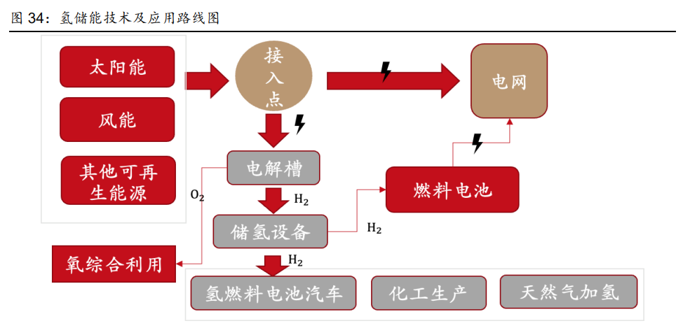 與其他儲(chǔ)能方式相比,氫能更能滿足大規(guī)模、長(zhǎng)時(shí)間消納需求。與抽水儲(chǔ)能、鋰電池儲(chǔ)能 等方式相比,其具有邊際成本低、能量密度大、無(wú)自衰減等優(yōu)勢(shì),能夠?qū)崿F(xiàn)跨周、跨季儲(chǔ) 能。但其實(shí)際應(yīng)用需要經(jīng)過(guò)光伏發(fā)電到制氫再由儲(chǔ)氫發(fā)電的兩次轉(zhuǎn)換,短期內(nèi)儲(chǔ)能效率較 低。鋰電儲(chǔ)能的效率更高,適用于日度調(diào)峰;氫能更針對(duì)于大規(guī)模儲(chǔ)能和季度調(diào)峰,擴(kuò)容 只需要增加儲(chǔ)氫設(shè)備,邊際成本更低。
