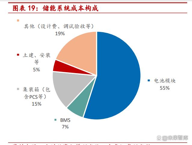 電池為儲(chǔ)能系統(tǒng)第一大成本。儲(chǔ)能系統(tǒng)成本主要由五部分構(gòu)成:電池模 塊、BMS 系統(tǒng)、集裝箱(含 PCS 等)、土建及安裝費(fèi)用、其他設(shè)計(jì)調(diào)試 費(fèi)。以浙江省一工廠的 3MW/6.88MWh 儲(chǔ)能系統(tǒng)成本為例,電池模塊占總 成本的 55%。