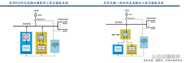 商業(yè)儲(chǔ)能系統(tǒng)架構(gòu)主要有兩種:1)采用 PCS 的交流耦合型;2)采用光儲(chǔ)一體機(jī)的直流耦合型。交流耦合系統(tǒng)與儲(chǔ)能電站的系統(tǒng)配置類似,但相對用量較小,系統(tǒng)功能也更為簡單,其中的光伏系統(tǒng)和儲(chǔ)能系統(tǒng)并聯(lián),靈活性較高,適用于已安裝工商業(yè)光伏的存量市場。直流耦合系統(tǒng)通過光儲(chǔ)一體機(jī)將光伏逆變器和雙向變流器整合在一起,相比交流耦合系統(tǒng)具有高度集成化、軟性成本低的特點(diǎn),50-100kW 的光儲(chǔ)一體機(jī)已逐漸成為中小工商業(yè)儲(chǔ)能系統(tǒng)的選擇。