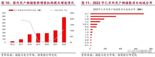 我國工商業(yè)用戶側(cè)儲能起步于 2016 年左右,早期主要依靠國家出臺的相關(guān)支持政策推動,隨著工商業(yè)儲能商業(yè)模式持續(xù)成熟清晰,工商業(yè)用戶側(cè)儲能新增裝機規(guī)模提速明顯。截至 2022 年,國內(nèi)用戶側(cè)儲能新增裝機規(guī)模達(dá) 764.73MW,同比增速超過 100%,其中工商業(yè)儲能占用戶側(cè)新增裝機規(guī)模的 80%-90%左右,并且主要集中在浙江、廣東、安徽、江蘇等地,對于國內(nèi)市場而言預(yù)計未來用戶側(cè)儲能將以工商業(yè)用戶為主,未來空間廣闊。
