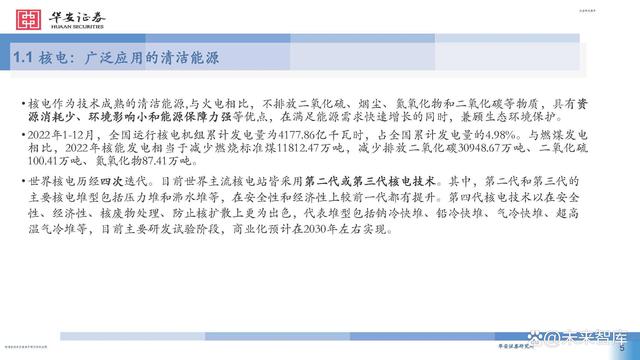 2022年1-12月,全國運行核電機組累計發(fā)電量為4177.86億千瓦時,占全國累計發(fā)電量的4.98%。與燃煤發(fā)電 相比,2022年核能發(fā)電相當于減少燃燒標準煤11812.47萬噸,減少排放二氧化碳30948.67萬噸、二氧化硫 100.41萬噸、氮氧化物87.41萬噸。 世界核電歷經(jīng)四次迭代。