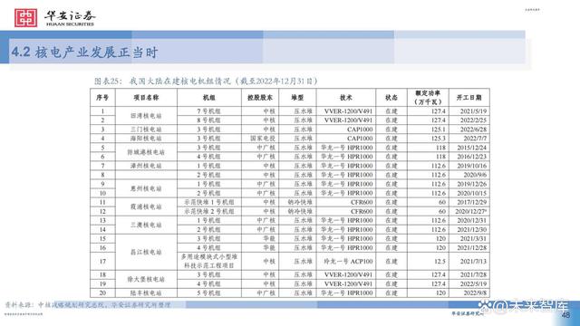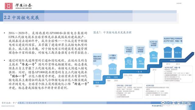 2016~2020年,美國西屋的AP1000和法國電力集團的 EPR三代核電技術全球首堆先后在我國成功建成投產(chǎn)。 我國在過去近40年中,成為全球唯一一個從沒有中斷核 電項目建設的國家,且掌握了建造世界主流核電機型的 能力,施工能力卓越,對于核電項目的建設有先進管理 理念和豐富的經(jīng)驗,對核電工期具備強有力的掌控能力。