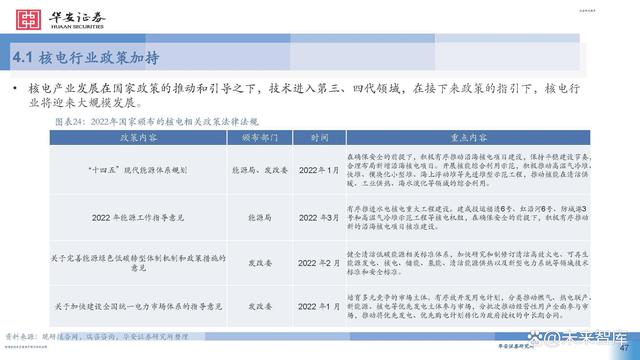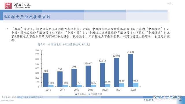 據(jù)中國核能行業(yè)協(xié)會發(fā)布的2022年能源產(chǎn)品產(chǎn)量統(tǒng)計數(shù) 據(jù)顯示,中國核能發(fā)電量僅占總發(fā)電量的4.98% ,低于 中亞和東亞平均值6.3%相比于北美的 18.8% ,北歐、西 歐和南歐的 24.2% ,東歐的 22.1% ,中國核電在低碳政 策背景下的發(fā)展?jié)摿Ψ浅4蟆?此外,無論是國內(nèi)大規(guī)模上馬核電項目還是核電走向國 際市場,其經(jīng)濟效益十分顯著。在國內(nèi),核電項目被稱 為印鈔機,在雙碳減排的驅(qū)動下,以前還受到電網(wǎng)調(diào)峰 要求的各核電站,近兩年來已經(jīng)是應發(fā)盡發(fā),機組有效 利用小時數(shù)紛紛創(chuàng)出新高,電廠效益節(jié)節(jié)攀升。核電項 目投資也受到各地方政府和各大銀行的大力支持和追捧。 作為一個政策導向型顯著的行業(yè),近年來迎來了密集的 政策利好,可以預見我國核電行業(yè)將迎來一個高質(zhì)量發(fā) 展的黃金期。