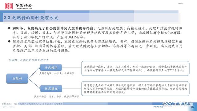 2007年,我國確定了符合國情的閉式燃料循環(huán)路線。乏燃料后處理屬于高精尖技術,處理廠建設需耗時10 年。目前,法國、日本、印度等國乏燃料后處理產(chǎn)能已可覆蓋最新年產(chǎn)生量,而我國僅有中核四0四有限 公司于2010年投產(chǎn)的中試廠產(chǎn)能為50tHM/年。 隨著壓水堆裝機容量快速增長,我國乏燃料的總量也將迅速增長。當前,我國乏燃料后處理基礎研究與俄 羅斯、美國、法國等國仍存差距,后處理關鍵設備如剪切機、溶解器等仍有待進一步研發(fā),尚未建成商用 后處理廠且不具備相應的運行經(jīng)驗。