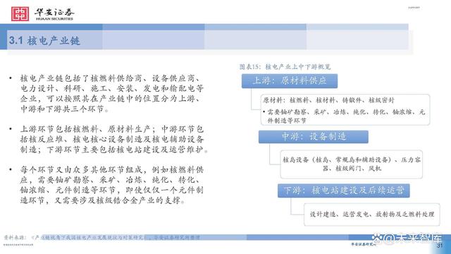 核電產(chǎn)業(yè)鏈包括了核燃料供給商、設備供應商、 電力設計、科研、施工、安裝、發(fā)電和輸配電等 企業(yè),可以按照其在產(chǎn)業(yè)鏈中的位置分為上游、 中游和下游共三個環(huán)節(jié)。 上游環(huán)節(jié)包括核燃料、原材料生產(chǎn);中游環(huán)節(jié)包 括核反應堆、核電核心設備制造及核電輔助設備 制造;下游環(huán)節(jié)主要包括核電站建設及運營維護。 每個環(huán)節(jié)又由眾多其他環(huán)節(jié)組成,例如核燃料供 應,需要鈾礦勘察、采礦、冶煉、純化、轉(zhuǎn)化、 鈾濃縮、元件制造等環(huán)節(jié),即使僅僅一個元件制 造環(huán)節(jié),又需要涉及核級鋯合金產(chǎn)業(yè)的支撐。