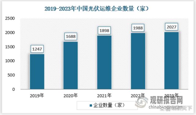 隨著我國(guó)光伏行業(yè)的發(fā)展,光伏裝機(jī)量的增長(zhǎng),對(duì)光伏運(yùn)維需求的增加,我國(guó)光伏運(yùn)維企業(yè)數(shù)量呈上升趨勢(shì),2023年我國(guó)光伏運(yùn)維企業(yè)數(shù)量達(dá)到2027家。