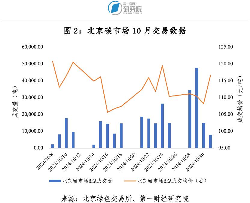 10月北京碳市場碳排放配額(BEA)成交量29.30萬噸,成交額3300.75萬元,成交均價112.67元/噸。10月最后一個交易日成交均價116.73元/噸,較9月最后一個交易日成交均價111.47元/噸上漲4.72%。截至10月31日,BEA累計成交量5704.22萬噸(公開交易2036.05萬噸,協(xié)議轉(zhuǎn)讓3668.17萬噸),累計成交額30.42億元。